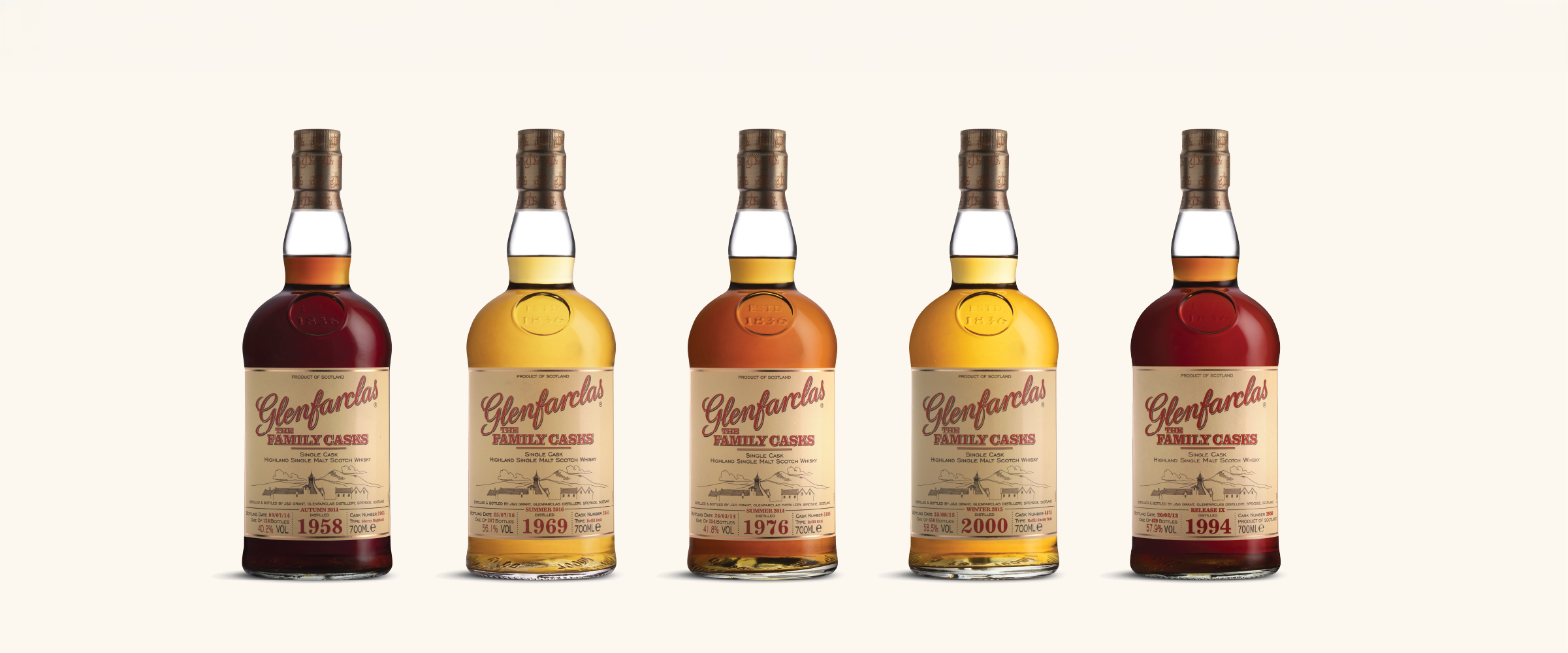 A series of painterly hero images was created to present the Glenfarclas Family Casks range as a cohesive collection. Lighting was carefully controlled to highlight the variation in colour and character across each bottle. The compositions balance consistency with individuality, allowing each expression to stand out while reinforcing the strength of the range.