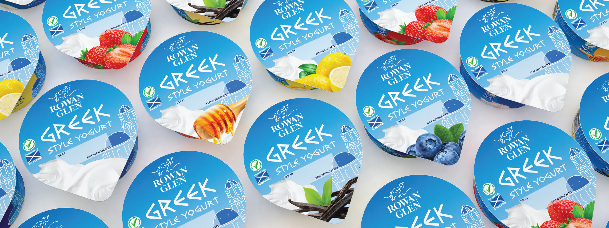 The Rowan Glen Greek Yogurt range was refreshed to improve stand-out on shelf. The existing wordmark and illustration were retained, with bold colour coding introduced for each SKU and supported by clear, flavour-led imagery across the range.